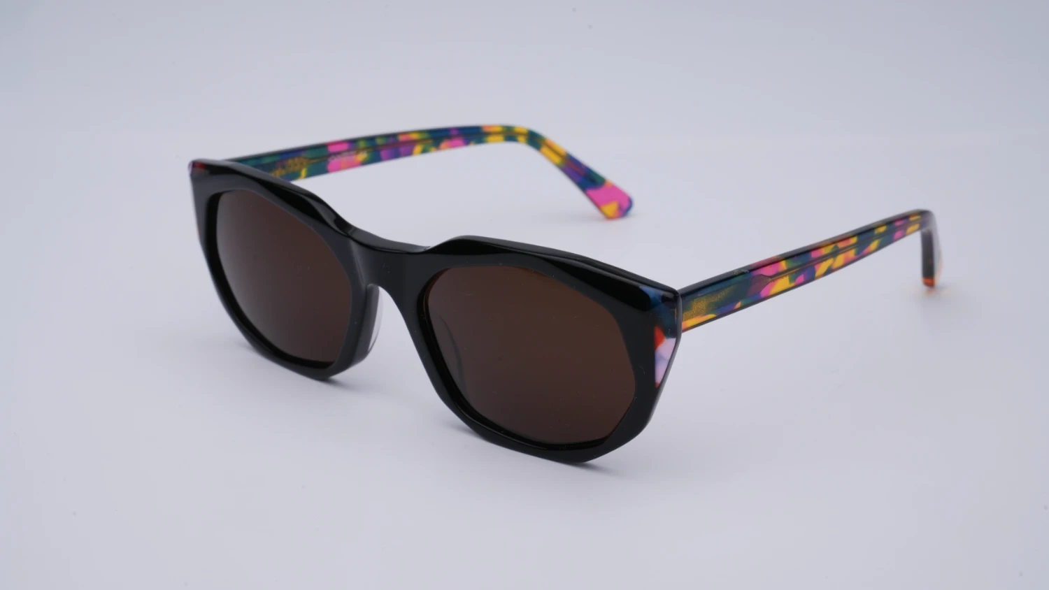 Oprawa okularowa reprezentująca wielokolorową kolekcję opraw okularowych i okularów przeciwsłonecznych marki Ghosteye Eyewear Radosława Wiktorowicza. Wielobarwność, przepiękna paleta barw i wyjątkowe kobiece formy to cechy rozpoznawcze marki. Prezentowany model to wariacja kształtów łączona kocią formę i wielokąt. To propozycja dla odważnych kobiet szukających efektownej i ciekawej stylizacji. Połączenie czarnego koloru na froncie oprawy z multikolorowymi zausznikami świetnie prezentuje się na żywo. Okulary będą dobrze komponować się z różnymi kształtami twarzy. Produkt wykonany jest z wysokiej jakości acetatu i wyprodukowany w wąskiej, limitowanej ilości. Do okularów dołączone etui i ściereczka z mikrofibry.